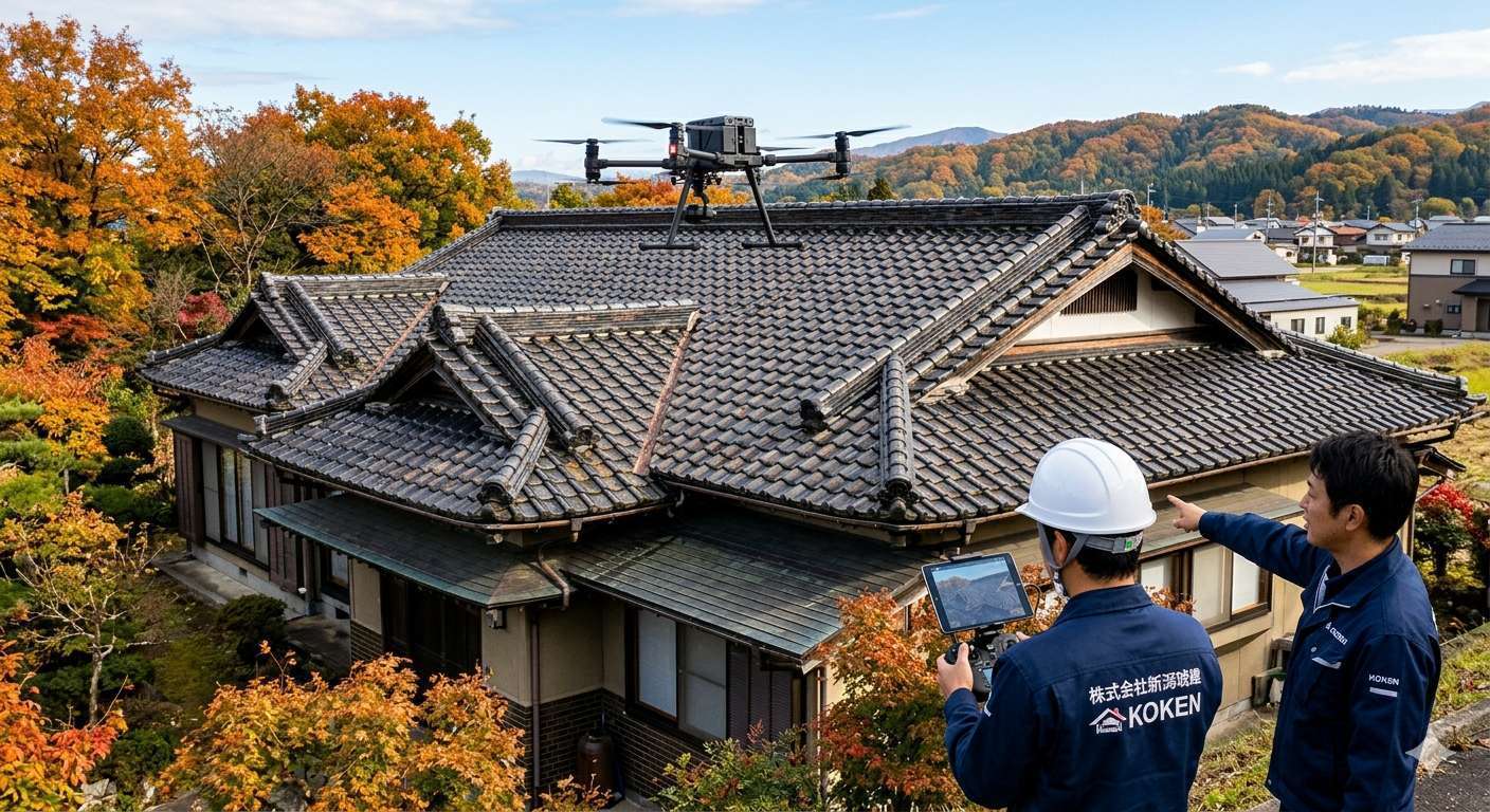 新潟市 屋根修理 / 新潟県 屋根リフォーム / 屋根塗装 新潟 / 雨漏り修理 費用 / ドローン屋根点検 無料 / 新潟琥建 評判 / ガルバリウム鋼板 葺き替え / 屋根メンテナンス 時期