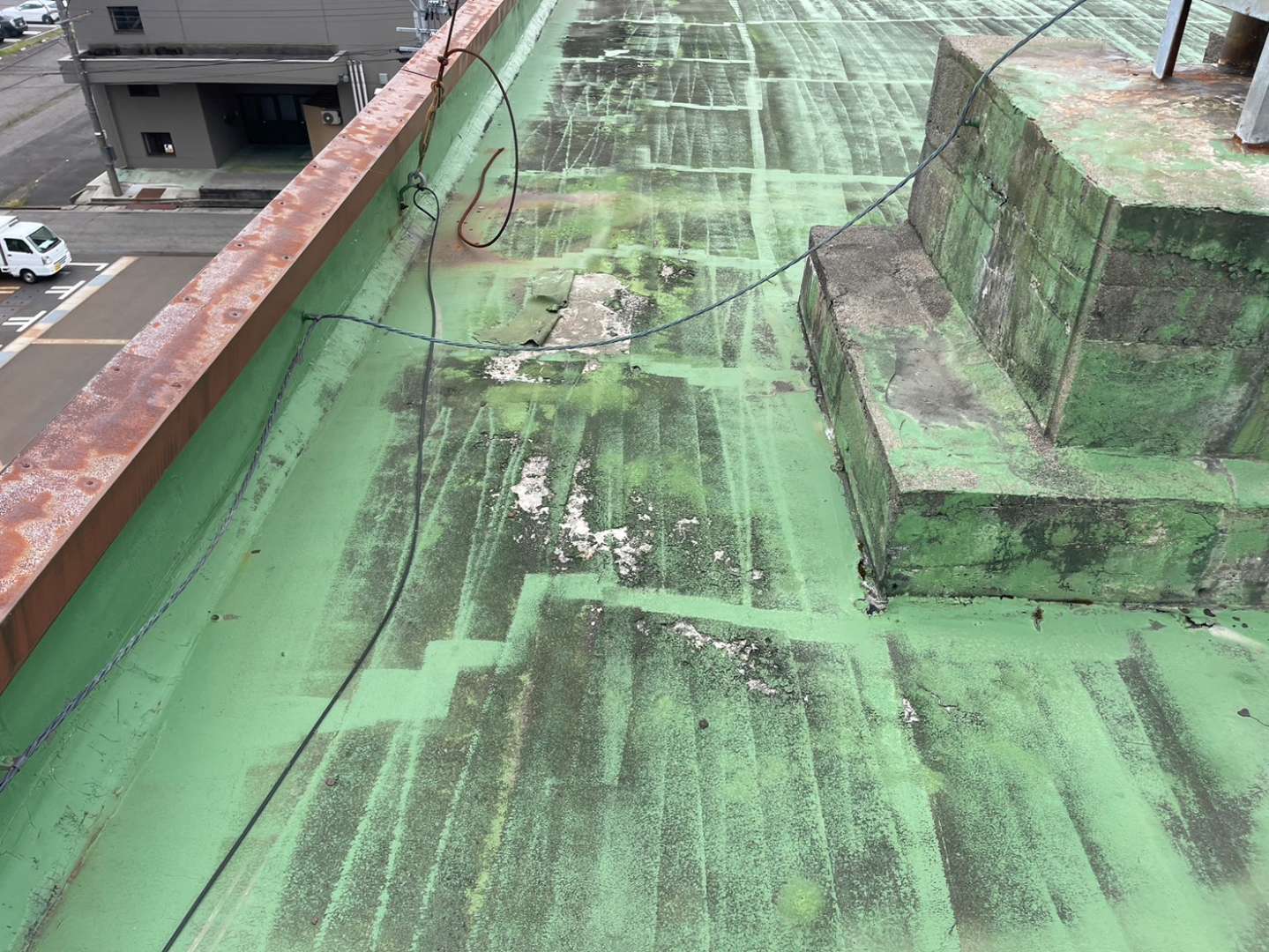 既存防水層の汚れ・コケ・ホコリ・旧塗膜の弱い部分を除去するため高圧洗浄を実施。