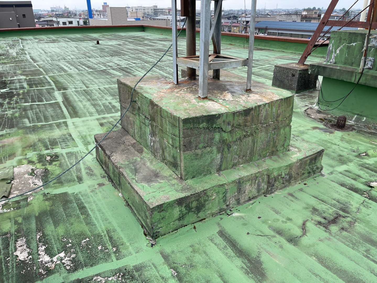 アンテナ架台周辺は防水層が切れやすく、雨漏りが発生しやすい部分。